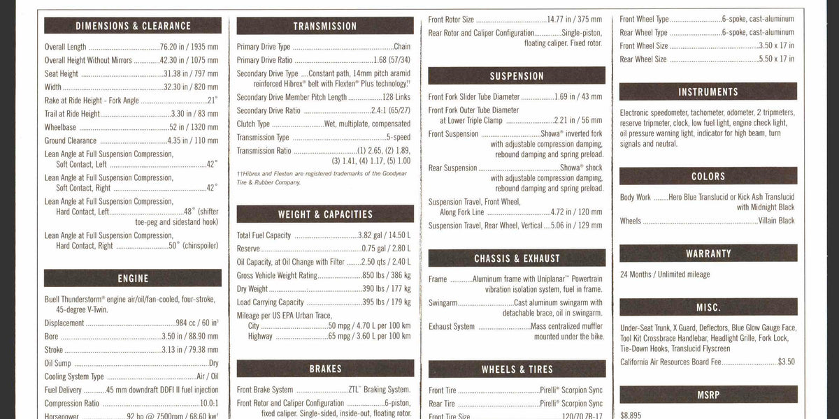 2006 Buell Motorcycle Dealer Sales Floor Specifications Card